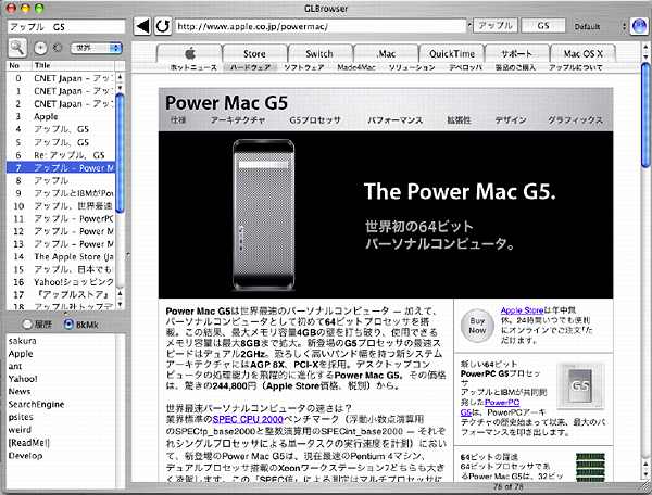 ・[New in ver 0.2]このほかにGLBrowserに表示されたWebページの一部を選択。そこからコンテクストメニュー(Ctrol + click)でGoogle Searchを選択するか、Control + Fで選択部分の検索ができます。