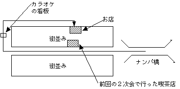 ナンパ橋をあとにした私達は、前回の大阪合コン2次会で行った喫茶店の前を通ってずーっと街をぬけて行った。かなりの距離を歩いたと思ったときに右に曲がっていきなり静かなエリアにはいった。そこで我々はカラオケの看板を非常に悲惨な顔つきで見つめている女の子の二人組に出会ったのである。