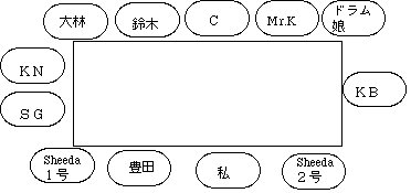 さて例によって最初の座席をきめる際には多少の混乱があった。なんだかんだと決まったのが以下の配置である。