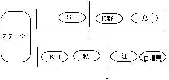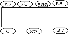 さて6人になった我々は、さっそく白札やに向かった。案内された席は、座敷であった。かなりたってK江が来て、結局自爆男は1時間近く遅れたが最終的な座席は次のようであった。