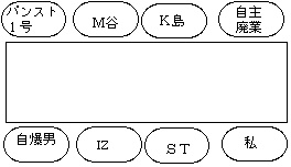 私の前に座っているのが自主廃業である。彼女は名前が示すとおり自主廃業した会社につとめているのである。彼女はのんびりした感じの女の子であり、おもいきりボケをかましていた。(もっとも内容についていは覚えていないが)
