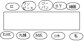途中でM氏が登場したところでけっこう席替えを行ったので、最初はこういう配置でなかったがまあおおむねこういう風である。もっとも後半になるに従って私とO木と細面以外はけっこう席替えが行われていたのでぐちゃぐちゃであった。