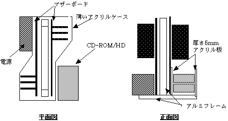 その次の週はひたすら頭のなかで部品を組み合わせてあれこれ考えていた。(例によって仕事は何もないから時間がたくさんある。)構想では、骨に必要は部品を全部くみつけ、表面は薄いアクリル板でつくったケースを埃よけにかぶせるつもりだった。電源ユニットはむき出し。ドライブ類は縦につみかさねる。この「縦につみかさねる」ために、厚さ5mmのアクリル板を使う予定だった。使用する予定のアルミのフレームは厚さ5mmの板であれば、はさんでたてることができるのである。私の頭の中では構想は完璧であった。しかし私も自分の不器用さと37年もつきあっているわけではない。これが形になったときに何が起こるかは私が一番良く知っている。