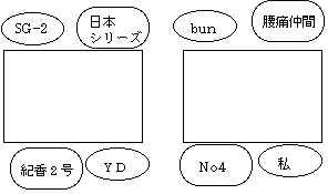 そんなことをぐでぐで話していると、私が話している側からみて、YDの後ろのほうから目のぱっちりした髪の長い女性がこちらをちょろちょろと見ている。私はひょっとしたらこれは相手の幹事やもしれん、と思ったが、私の位置から見てYDの背中のほうに見えるということは、YDから全く見えないということだ。しばらくそんな談笑を続ける間に男性の残り一人SG−2が登場した。彼はYDと同じバンドに所属していて、私のバンドのドラマーとキーボードプレーヤーと同じ職場に居る。従ってこれまで何度か名前は聞いたことがあったのだが実物を目にするのは初めてだ。私は「おうわさはかねがね」と言った。彼はちょっと控えめに挨拶をした。みればなかなかしゃれた格好(私から見ての話だが)をした細身のまじめそうなお兄ちゃんである。