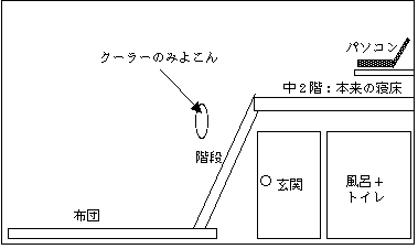 さて、とりあえずその姿勢をとるとようやく一息つける。いろいろな事を考え出した。この調子ではしばらく動くことはできない。となれば明日の会社は休みだろう。しかし最近仕事は何もしていないのだからあまり問題はない。そう思うともうちょっとさしせまった心配も頭に迫ってくる。今は夏だ。となれば大変暑いことになる。なんとか通気用の窓を閉めてエアコンをつけたいと思う。しかしそのスイッチは私からはるかはなれたところにある。ここでちょと私の部屋の構造を書いてみよう。