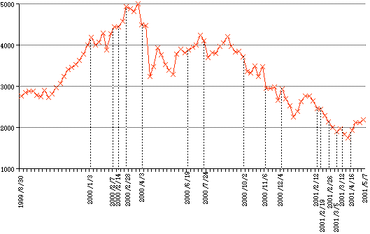 ハイテク株暴落の後。シスコやインテル、そしてヤフーといったハイテク優良銘柄が最近、相次いで下方修正を発表したことから、2001 年だけでなく2002 年も予想収 益 の下降基調が続く可能性が出てきた。テクノロジーセクターの予想PER は大幅に低下しているが、これからさらに低下するように思える。従って私はテクノロジーと通信サービスのアンダーウェイトを引続き推奨する。