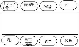 私の前に座っているのが自主廃業である。彼女は名前が示すとおり自主廃業した会社につとめているのである。彼女はのんびりした感じの女の子であり、おもいきりボケをかましていた。(もっとも内容についていは覚えていないが)