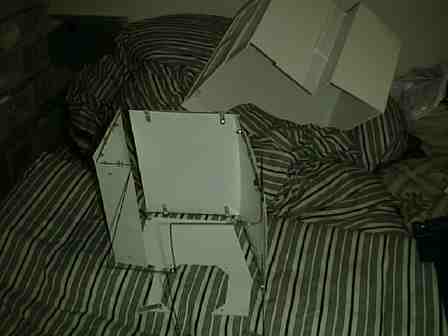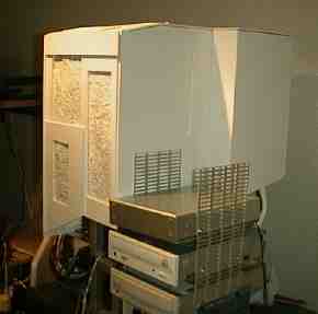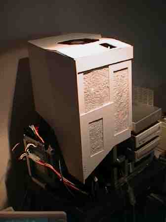 そうはいってもさすがに今度はいきなり別の構想に走りだすことはなかった。このケースとは一週間くらい暮らしたのである。それまで完全に解放された空気の中で動作してきたMacintoshだから、果たしてケースをはめたときに過熱しないだろうか、とかなり心配だったが、記録的な猛暑だった2000年の夏に、これまた異常に熱い屋根裏部屋とも言うべき私の部屋の中二階に放置しておいても熱望走する気配は見せない。この構想はそんなに悪くなかったかと思ってはみたが、いかんせん格好が気に入らない。こればかりは何ともしようがない。