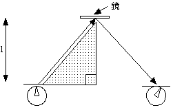 具体的に計算してみよう。(面倒だと思ったらとばしてもらっても定性的理解には支障がない)網をかけたところに直角三角形ができていることに注目する。天井と床の間の距離はl、光が床から天井の鏡に到達するまでの時間(往復の半分)をtとすると、ピタゴラスの定理から