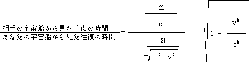 この比を数式で示してみよう。vの値が0より大きいとすれば、分母はcよりも小さくなる。ということは往復の時間はは2l/cよりも大きくなるからだ。先ほど求めた「あなたの宇宙船から見たときの往復時間」との比をとってみると