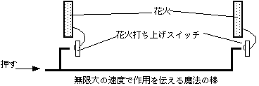 あなたの手元に棒の端をおき、その端を押すと近くの花火打ち上げボタンを押す様にし、棒のもう一つの端は別の花火の打ち上げ用ボタンのところに置く。あなたがこちらで棒を押すとあなたの近くの花火がうちあがるとともに、遅れ時間0で(魔法の棒の定義により)別の花火の打ち上げようボタンがおされ、別の花火もうちあがる。なるほどこれならば誰がどうみても