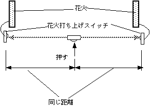 二つの花火のちょうど中間点にあなたは座る。ここからスイッチを押すと光が発射され、今度はスイッチは光が伝わるとオンになることにしておく。花火までの距離は同じだから信号が伝わるのにかかる時間も同じ。したがって花火は同時にうちあがる。
