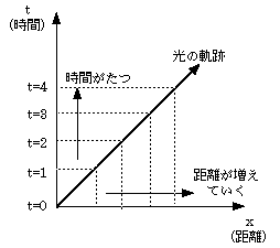 光の先端は時間とともに動いて行くから、時間と位置の組あわせで「イベント」ということができるだろう。この図はなかなか見晴らしがよろしい。考えてみればもともと二つの変化する値の組み合わせで決まる物を図示しよう、というのだから、その昔学校でならった縦軸と横軸に別の値をとれる