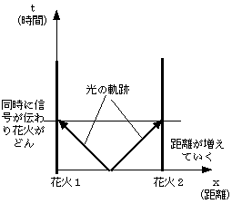 信号が前方と後方に伝わっていく。速さは両方とも真空中の光速:Cである。が前方の花火はこちらから遠ざかり、そして後方の花火は近づいてくる。したがって最初に後方の花火に信号が届きどんとうちあがり、そして次に前方の花火に信号が届きどんとうちあがる。誰だ花火を同時に打ち上げたって言っているやつは。