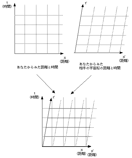 まず「相対性理論」の事を忘れて、「普通の物の見方」で考えよう。あなたの宇宙船からみると、別の宇宙船は時間がたつに従って、x方向に動いていく。しかし相手からみれば、あなたの宇宙船のほうがーx方向に動いていることになる。