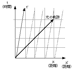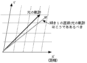 こうした図で書くと、速度が大きくなると軌跡は寝る(つまり傾きが小さくなる)ことになる。上の図では傾きが1より大きくなっている、つまり光速度はcより小さくなってしまっているのだ。