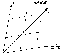 上のグラフに光の軌跡を重ねてみよう。先ほどの同じに光の軌跡は傾き1の直線で表されるから