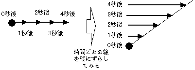 まず左のように書いてみる。と、いろんな時間の状態が重なって書かれて見にくいことこの上ない。よし、では時間ごとの絵柄を縦にずらして並べてみよう、と思うと右図のようになる。