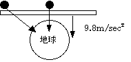 下の図のような状態を考えると、なんだかあやしくなってくる。飛行機ならぬ板は確かに地球に向かって9.8m/sec2で加速している。真ん中あたりの物体は確かに無重量になりそうだが、端の方はどうだろう?だいたいもともと引力の働いている方向は真下(板にとって)ではないし、この絵でも解るとおり地球からの距離も違うから引力の大きさも小さそうだ。