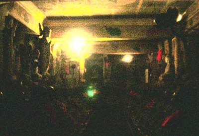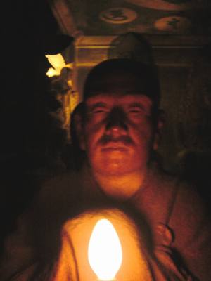 礼を言い階段を下りると先は暗くなっている。言われたと おり右手で壁に触りながら前に進む。長野の善光寺でこういう暗い通路を通った事があるように思う。あのときもそうだったが、真っ暗な中を歩くと頭に何かぶ つかるのではないかという強迫観念にとらわれ腰が曲がってくる。しかし今の私は腰痛持ちだから中腰の体勢というのは避けたい。右手で壁に触り、左手で頭を カバーしながら進む。端で見ていたらさぞかし滑稽な姿であろう。道は曲がりくねっており、自分がどこにいるかもわからない。