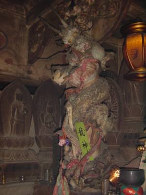 この周りには仏像がうじゃうじゃあるのだが、ぼんやりとした明かりに浮き上がるそれらの姿はなんとも言えぬ迫力を発している。いるのは仏像ばかりではなく、柱にはこんなものが巻き付いている。