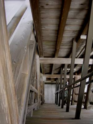 さっそく昇ってみる。靴を脱ぎここも上りと下りに分かれている階段を上る。上りが外側であり、大変眺めがよろしい。それはいいことなのだが私は高所恐怖症なのであった。自然と歩くのは階段の端(内側)になるし、どうにも足がすくんでいるような気がする。いやここで負けてはならない。雨天時は「安全のため」閉堂する、と書いてあるがさもありなん。ぬれるとどうなるか想像がつかないがとにかく危険そうだ。