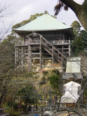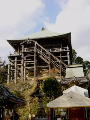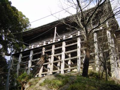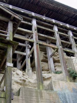 あれこれ調べるとここの構造は四方懸造りというらしい。清水の舞台のように地盤から柱を立ち上げ建物を造るのが懸造り。たいていの場合は一面だけこの構造なのだが、このお堂は四方ともなのである。結果として地上から高く高く柱が延びた上にお堂が載っている。つまり小山を抱え込みその上に本堂を造っているのである。