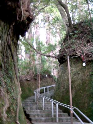 そのうち三本杉とかいう看板が見えてきた。立派な杉の木だ。その先には「霊木 子授楠」と看板がついた大木があり、木の根っこに開いた穴から人間が通れるようになっている。家族連れが写真を撮ろうとしており、娘さんが穴を通るところを収めようとしているのだがやれ