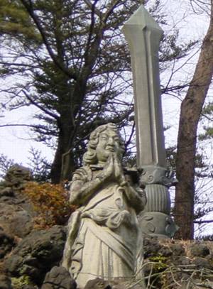 コンクリートで固められた通路を通ると外に出る。ふと気がつけば山の上にもなにやらあやしげな剣と像がある。剣はともかくこの像は何者なのだ。