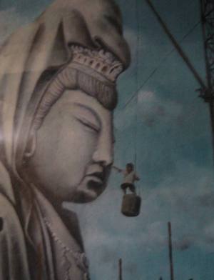 300円払うと大仏の中に入る。いきなりいろいろな像がでてくる。最近色を塗り直されたのかなかなかサイケデリックでけばけばしい。そのうちこれは像というより半分(というか1/3)だけ浮き出たようなレリーフであることにきがつく。一番上の階にはこんなのがいる。
