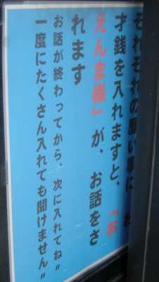 文末の「”」はいったい何の記号なのだろうか。お賽銭を入れると「おえんま様」がお話をしてくれるという。ここではえんまに「様」だけではなく「お」がつくのか。それはいいとしても「おえんま様」は「どうぞ宜しくね”」と語るのであるか。妙に優しいというかどことなく女性っぽいというか。絶対本当にね”とまで念を押すところをみると「おえんま様」は心配性なのか、あるいは結構ねちっこい性格なのか。