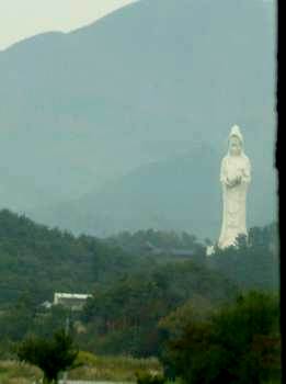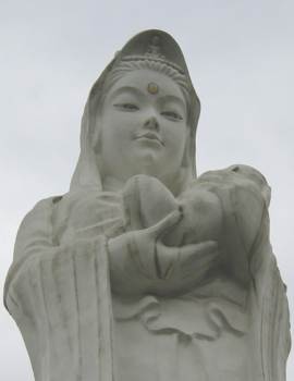 いくばくか歩いた後、観音様の足下にたどり着く。最初に観ていた時から気づいていたが、この観音様、目がぱっちりしているせいかなんとなく顔が人間っぽく見える。笑っているようにも見え、子供を見つめているところは思い詰めているようにも見える。
