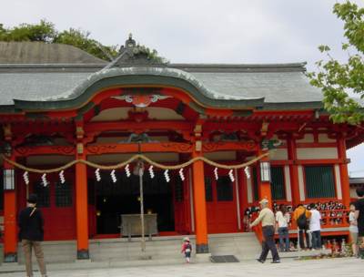 何人か同じ電車に乗っていた人が同じ方向に歩いていく。その人達について歩いているうちはよかったが、そのうち追い越してしまった。となると道がわからなくなる。まあこっちだんべと歩くと事しばらく。通りはとても静かであり、古い建物がたくさん存在している。その割には時々「カラオケ喫茶」などという看板がでてきて驚く。次の角を曲がれば目的地か、と思ってもそんなことはあり得ない。看板に20分と書いてあればほとんどの場合20分かかるのだ。そのうち目的地らしき場所が見えてきた。朱塗りの大きな鳥居が見える。門前には何かを売っている店がいくつかあり結構にぎやかである。鳥居をくぐりずんずん進んでいくとこんな光景が広がる。