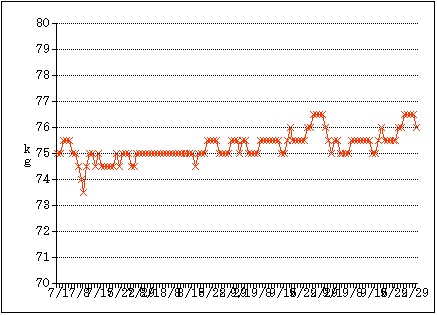 8/9-8/15の一言:冗談のようですが、ずーっと75kgです。体重計は別に壊れていないようです。2日ほど旅行してはかりを抜かしてはいるのだけど計った時はいつもこの値です。