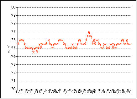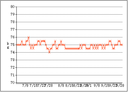 7/1-7/7の一言:Yea, I'm getting fat. so what ?とひらきなおっている場合ではありません。血圧も上昇しているし。。ひさびさの75.5という数字ははっきりいって恐怖です。最近メールの最後が「大坪@わおーん」から「大坪@ぶよぶよ」にかわりました。